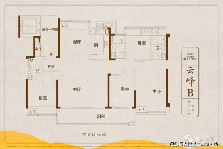 179平米:四房两厅三卫,四开间朝南,149平米的优化版,客厅面宽加大,同时厨房改到一侧,客餐厅做到完全的南北通透