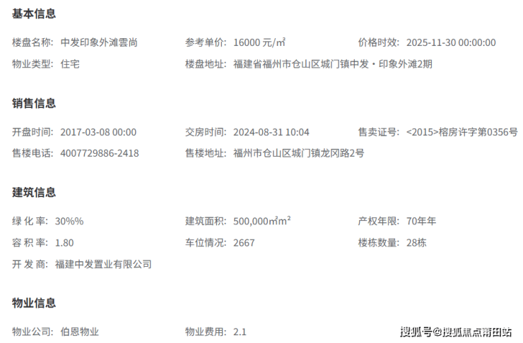 项目由福建中发置业有限公司开发,伯恩物业提供物业服务,物业费为2.1元/月/平方米。