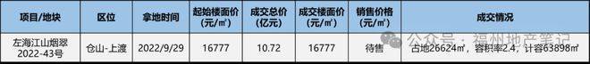 2022年9月29日左海以底价10.72亿竞得2022-43号地块,楼面地价16777元/㎡,当初市场来看,地价不算太高,毕竟火葬场的【龙湖九里晴川】当年售价约为2.5万元/㎡,月均卖25套左右。