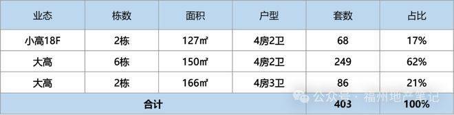 规划127-166㎡三个面积段,其中127㎡占比17%,150㎡以上占比62%,166㎡占比21%,低改产品为主。
