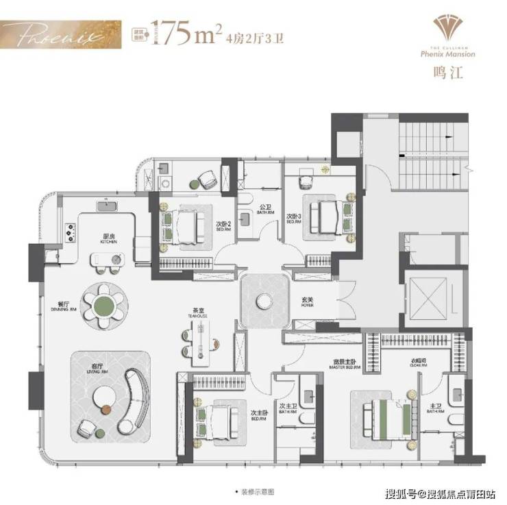 175㎡户型配置双开门,三面环景端厅设计,最长约30米景观面,通过升级弧形曲面玻璃实现270°双面瞰江享受,约63㎡LDK+X一体化转角厅可实现更多功能。户型还设计了“十字方厅”,这些通常是市面上200多平超大户才有的组合配置。加上约33㎡的主卧套房及3.3米层高,让整个户型空间感、仪式感和实用性更凸显。