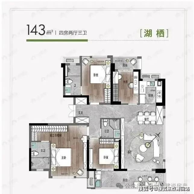 目位于晋安区北区涧田湖片区,容积率2.2,纯商房,共6栋小高层,360套房源。户型有5种:75平、89平三房,109平、126平、143平四房。75平中间户三开间采光佳但不通透;89平、109平端头户双阳台三面采光;126平、143平一梯一户改善型产品,仅7号楼有,公摊小,143㎡还能看湖,不过有暗卫。