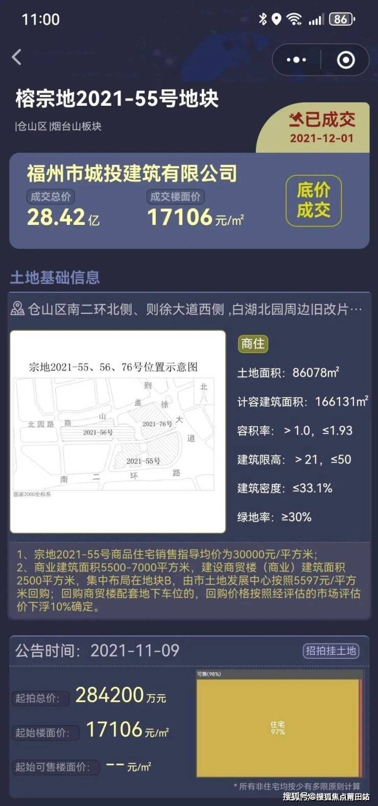 福州市城投建筑有限公司(福州工业园区集团的原名称,隶属于福州左海集团)于2021年12月28.42亿竞得榕宗地2021-55号地块,楼面价17106元/㎡,底价成交,地块住宅限价30000元/㎡。左侧的地块A内部存在保护古建,地块B临近则徐大道高架桥。