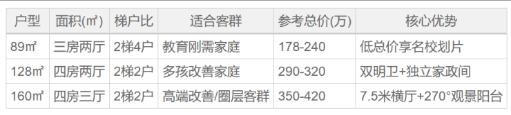 品质改善客群:128-160㎡户型优先选择东侧楼栋(远离高速),关注施工细节与暗卫整改。