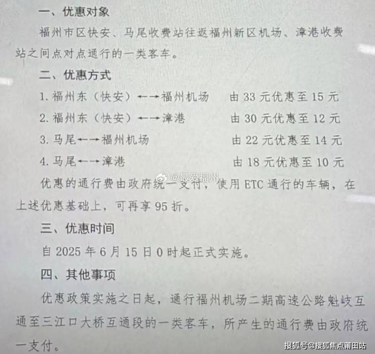 即日起,福州机场高速公路福州东(快安)、马尾收费站往返福州机场、漳港收费站之间点对点通行的一类客车,将享受通行优惠。