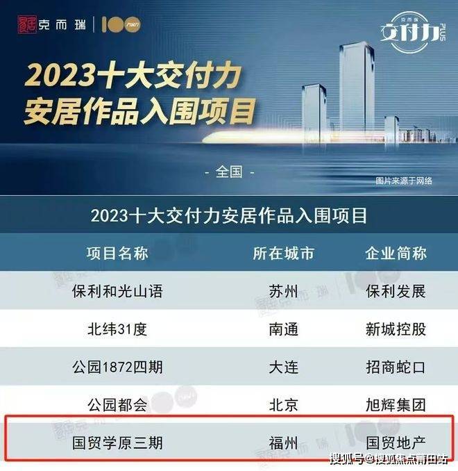 2024年,福州国贸学原三期凭借原系3.0舒居品质,荣获“2023年克而瑞全国十大交付力安居作品”提名,这也是入选该榜单的唯一福州项目,足以证明国贸地产在落地的真实效果、工艺细节、材质品质、服务体系等的高水准。
