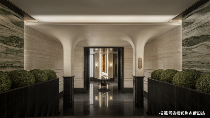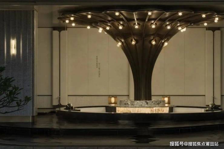 空间色彩以海派白金为美学基底,运用大体量的大理石石材勾勒视觉框景,兰花元素雕塑悬吊于大厅中央,外形轮廓整体保留了芝兰的柔美,螺钿镶嵌、罩金、贴箔工艺的亮面质感是艺术灵感的映射,构造出空间的“隐奢”性质。