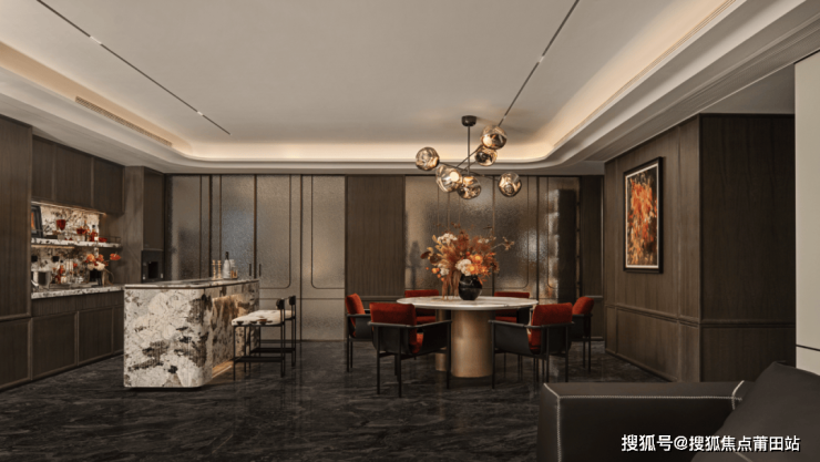 绿色奢石台面与金属吊顶交相辉映,温润而内敛。让人在此交谈品茗,心灵得以放松。