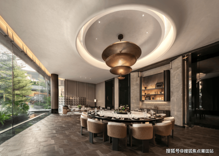 金属光泽的复古装饰在浅色建筑基底上静静绽放。设计以圆的聚合和弧形线条的优雅延展,勾勒出远处隐约可见的建筑轮廓,开阔的结构消除了内外边界限制,将无边水景衔入室内,营造无界美感。