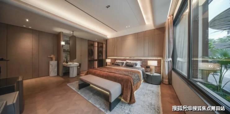 比五星级酒店总统套房还震撼的主卧套房,大面段短进深的设计,卧室南向面宽约4.3m,全景式开窗,实现的是主卧“大家化”的概念;10㎡独立入步式衣帽间,日常收纳全满足。