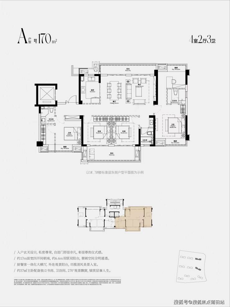 170 平方米户型:四房两厅三卫,一梯一户,是 150 平观景产品的升级,双主卧设计,特别是右侧主卧搭配书房,功能性强。约 17m 面宽四开间朝南,约 6.6m 双联双阳台,奢阔空间全明通透。厨餐客一体化大横厅,外连观景阳台,主卧约 37㎡,配备独立书房、卫浴间、270° 观景飘窗。不足是有一个暗卫,无法做到南北通透。