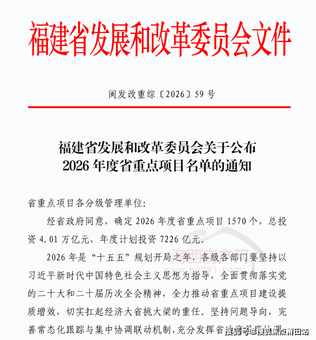 海西房产网(微信公众号:fjhxfcw)消息:2026年2月5日,福建省发展和改革委员会下发“关于公布2026年度省重点项目名单的通知”。