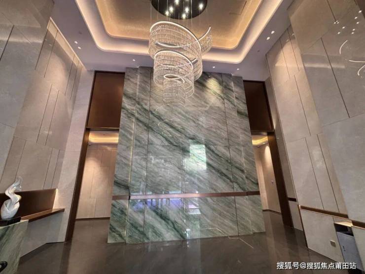 每栋楼前,都有“迎客松”,挑高的入户大堂,宽敞明亮,大堂里翡翠绿色圆角通顶“石壁”,会让回家的那一刹那,有如沐春风的感觉。