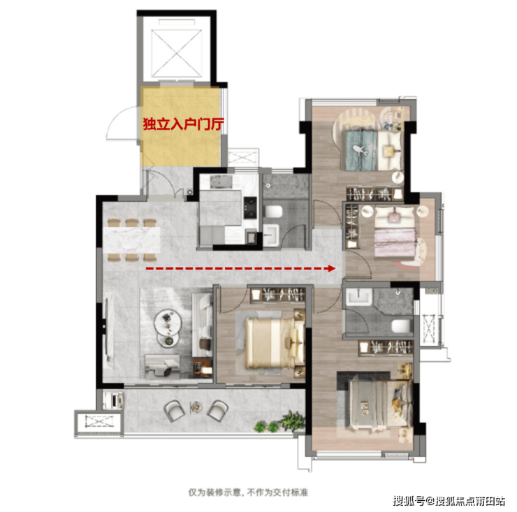 从户型设计来看,左海星悦颂的112㎡户型不仅合理利用了每一寸空间,更将“轻奢”品质发挥到了极致。例如,户型配备了独立入户门厅,各卧室之间可以根据需求自由设计,空间更具灵动性。南面的大阳台不仅拉大了空间尺度,还增加了采光和通风。同时,户型动静分区合理,多条动线“共享”,使动线更加流畅,也增加了使用面积和视觉宽敞度。