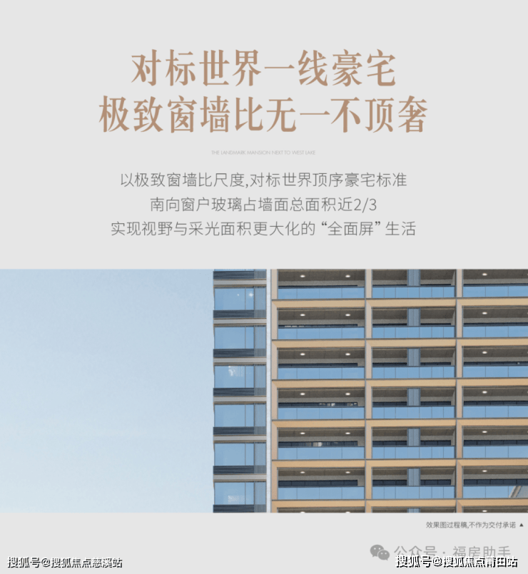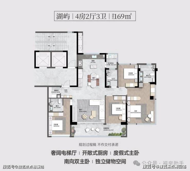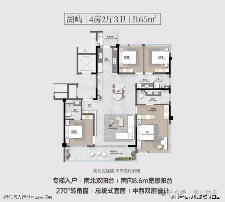 :采用独立电梯厅设计,一梯一户,四开间朝南,约 6.8m 奢阔阳台搭配 270° 转角窗,酒店式主卧套房。