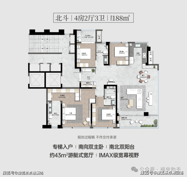 :客餐厅 L 型转角设计,约 43㎡游艇式宽厅,大主卧套设计,配备步入式衣帽间。