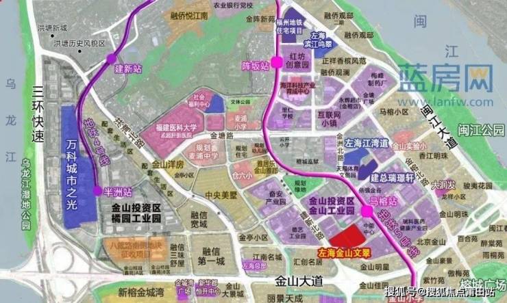 从区位上看,左海金山文翠项目位于仓山区金山大道北侧,紧邻地铁5号线马榕站,距离地铁2/5号线换乘站金山站约800米,周边有金山小学、金山实验小、大润发等生活配套以及众多产业园。