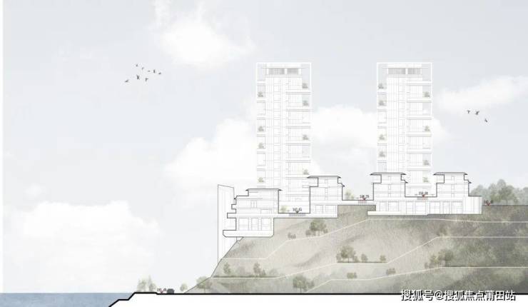 设计以场地40米高差作为出发点,尊重原始地貌,依山就势利用原有高低错台及挡墙,减少开挖及控制建筑体量;将场地悬挑与山体崖壁空间的充分融合,以大高差创造悬浮式建筑空间,通过与山地共融的方式来探索居住空间体验的新可能。