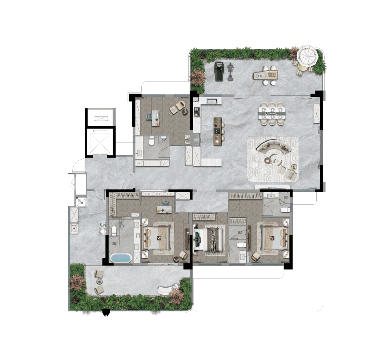 【国投 · 铂江一品】营造立体花园,它改变了户型的传统结构,让客厅、卧室与空中花园交融在一起,打破了室内外空间的边界。通过充分放大立体生态住宅空中花园的优势,进一步在设计中通过自由、舒展的超大面宽, “延长” 通透的观景边界面,以强化内外空间的连续性,让住户在新维度也能极致贴近、感受自然。