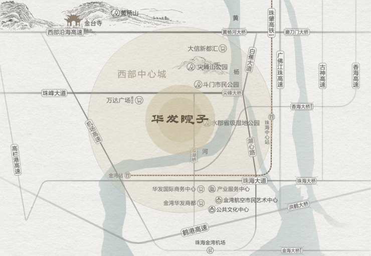 半径10 公里内文旅、商业、医疗、教育等配套一应俱全,繁华图景,举步即达,全方位满足日常生活需求。①文旅配套:超60万㎡(约1000亩)华发水郡省级湿地公园、尖峰山公园、航空新城六大中心、27洞金湾高尔夫;②商业配套:万达广场(建设中)、华发新天地、富元广场、金湾华发商都等;③教育配套:斗门区实验二小、容闳教育体系(幼稚园和小学)、珠峰实验中学等;④医疗配套:遵医五院、斗门妇幼保健院、西部医疗中心(建设中)等。