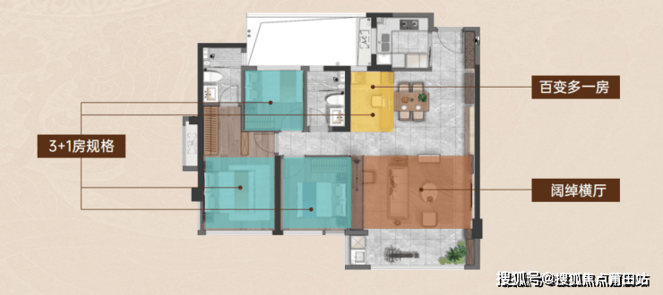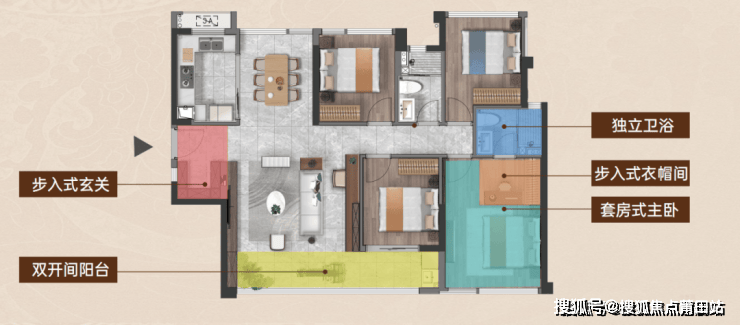 建面约114m²面宽约5.5m的厅堂空间,洄游动线更加流畅,同时满足增拓1房的尺度可能,实现再多一处书房、茶室、琴房的可能;约20m²的主卧空间,更实现了大容量衣帽间、独立卫浴等奢享的主卧场景;面宽舒展的次卧空间,亦能更好满足三口之家应有的居住尺度。
