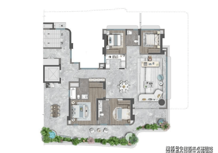 四房两厅三卫,独立电梯厅设计,南向双主卧设计,客餐厅一体化,搭配双面采光。