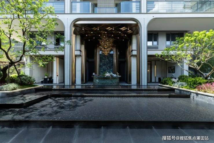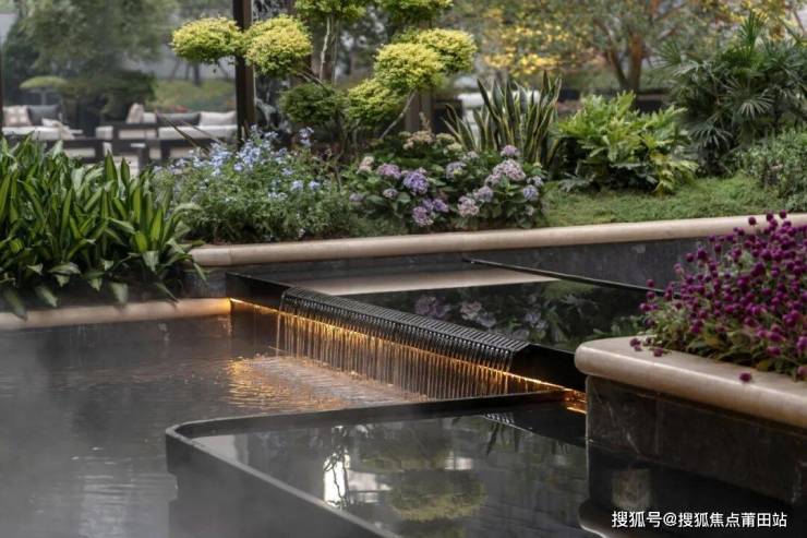 精心打造的180°环幕水景,以安哥拉黑仿石为基底,镜面般的水面倒映着蓝天、白云与周边24节气绿植,微风拂过,水面泛起粼粼涟漪,潺潺水声萦绕耳畔。