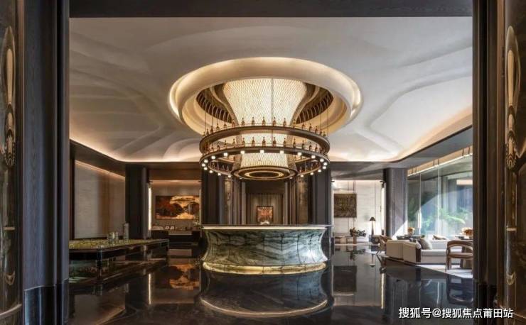 会所地下入口以酒店化标准设计,光厅顶面运用繁复的工艺,打造出如海浪般柔美的曲线造型。增强仪式感的同时,更象征着福州作为海滨城市的独特魅力。