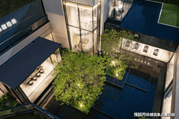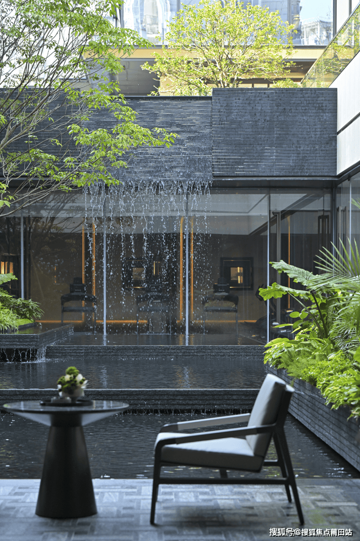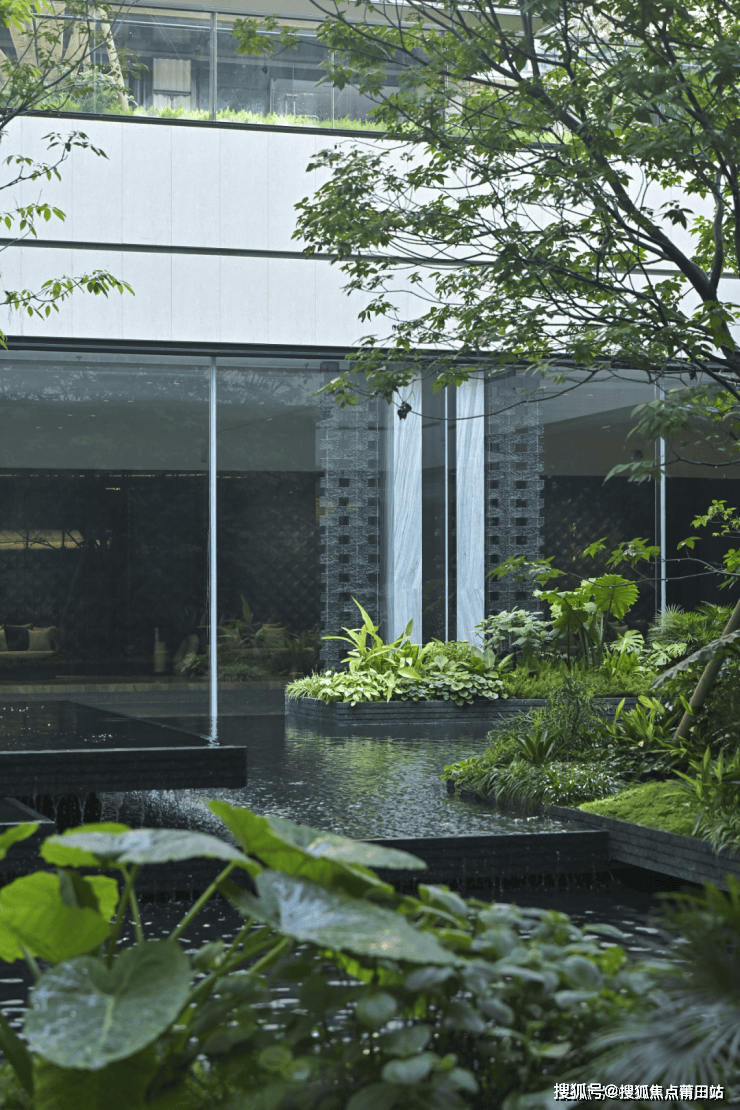 下沉花园旨在打造观赏性及沉浸感极强的森谷林涧,6米高的落瀑水流奔泻而下营造出林间瀑布景观。融合造型上的疏朗现代感,形成隐谧而清新的氛围。