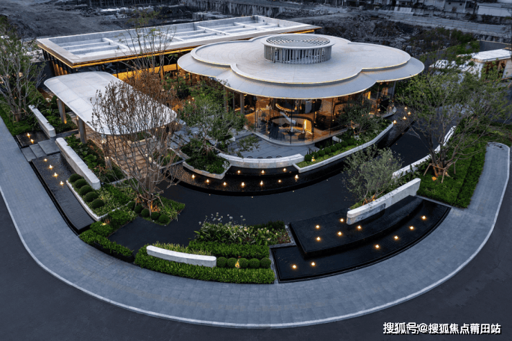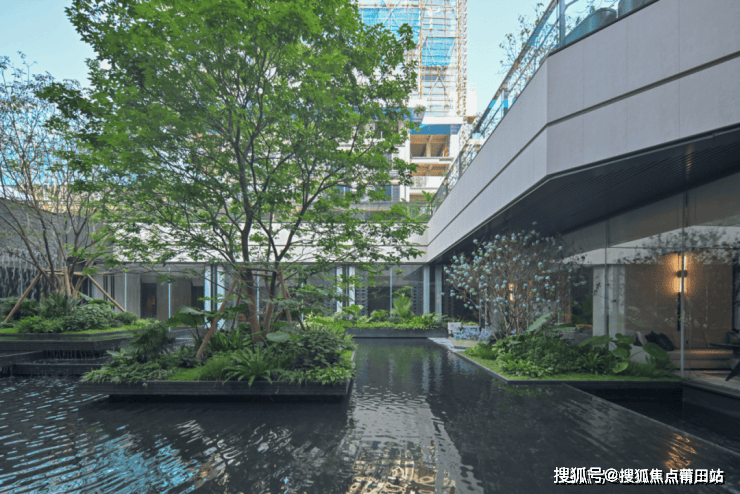 下沉平台采用圣诞米黄大理石花池,搭配带有南方热带种植氛围的植物,提供独特的休憩空间,让居者能在此处感受绿意与水声交织的美好。