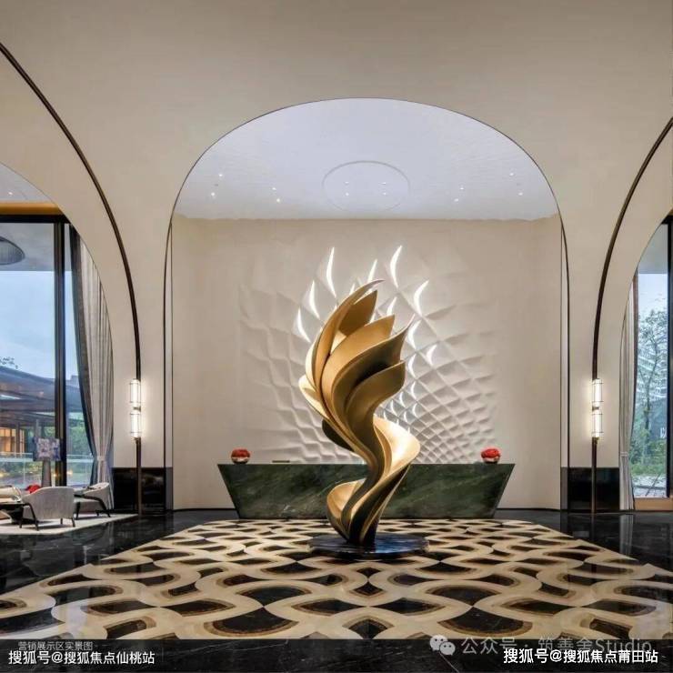 作为空间的迎宾序章,接待大堂注重仪式感,地面铺设着精致巧夺天工的拼花图案,犹如一幅动态的画卷,渐次引领宾客的目光。细腻的花纹与光影错落交织,营造出一种宁静而尊贵的气氛,每一步行走都仿佛是在历史长河中留下的深刻足迹。