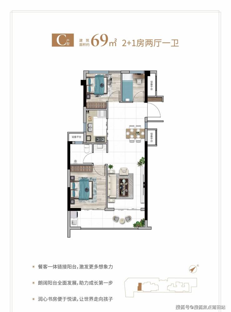 69㎡户型:南向双卧室+客厅,北向厨房连接服务阳台,适合刚需或投资客群;