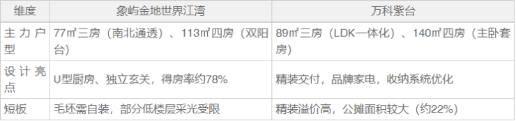 万科紫台:容积率2.0,纯高层社区,精装交付,户型以89-140㎡为主,采用万科“翡翠系”精装标准。物业为万科自有团队,口碑优于象屿,但社区绿化率仅30%,楼间距较窄。