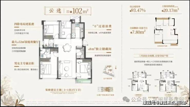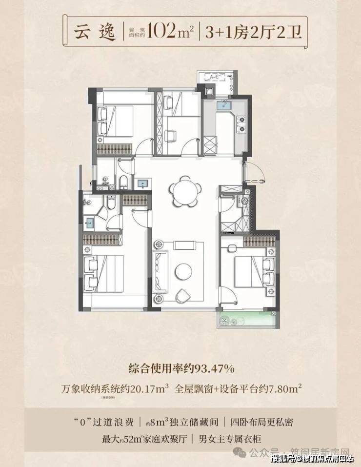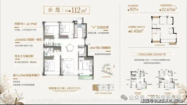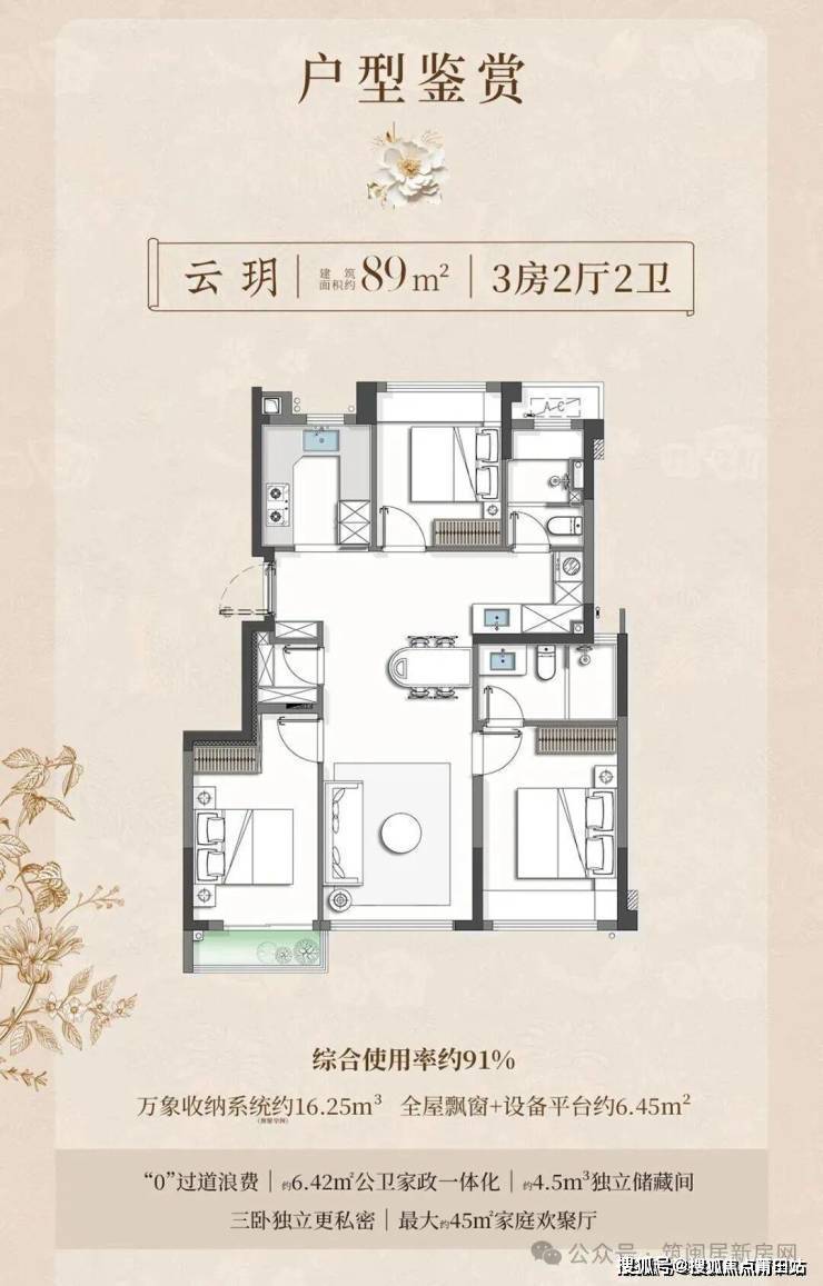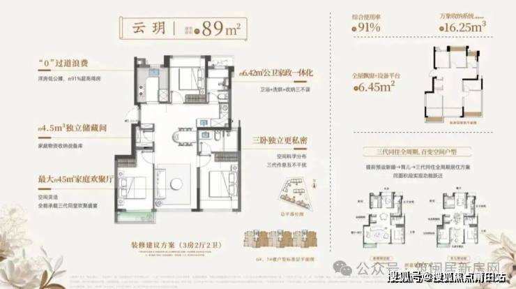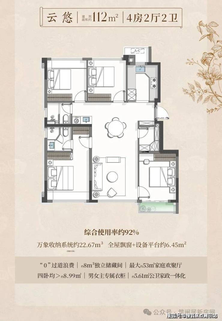 超高得房率是其最大亮点:89㎡得约91%,102㎡得约93.5%,112㎡得约92%。