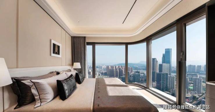 这一被命名为“凤凰耀金立面”的设计,融合了石材、铝板、玻璃幕墙、局部金属漆等多种材质,构建全屋落地窗+270°弧形转角全景视野。