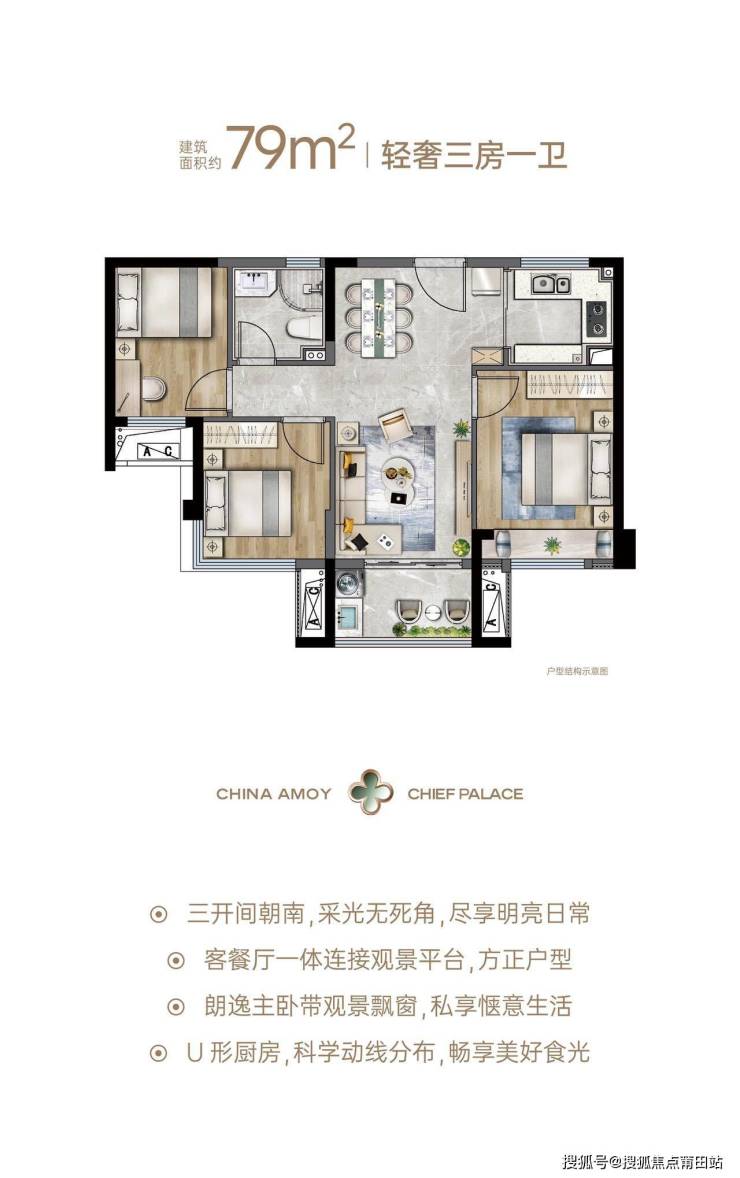 极致效率:建面79㎡实现三室两厅一卫,3.5开间朝南,主卧配置270°观景飘窗,破解小户型采光难题;