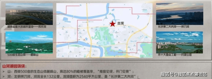 项目南临约1003亩月湖公园,西靠500亩生态山体麓峰山,北靠捞刀河风光带和苏托垸生态湿地,坐拥IMAX山景,远眺千米滨水河岸风光,超级绿肺举步即享,繁华都市里的静谧“桃花源”。