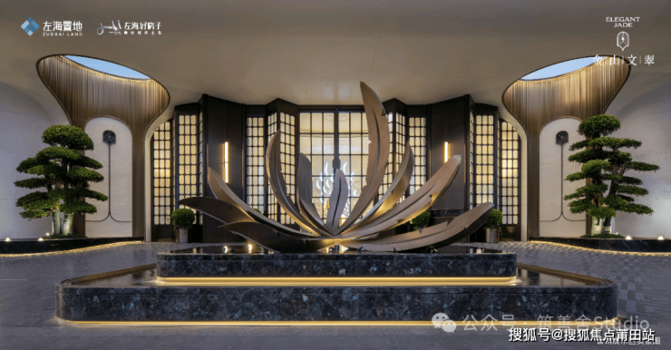 迎宾水景中的“百鸟朝凤”纯铜雕塑,以马达加斯加蓝翡翠奢石为底座,细节之处如门把手的凤翎纹绿奢石镶嵌,无不彰显其用心之深。