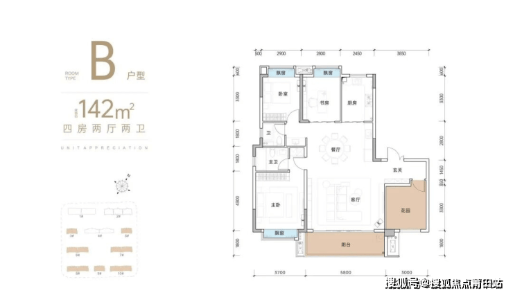 5号栋两梯两户,1个单元,户型142㎡14层