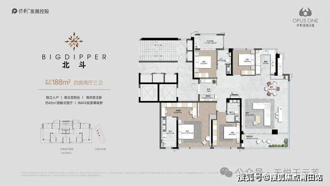 独立电梯厅,270°转角窗,270°L型阳台,星级酒店式主卧,约8.1m奢阔端厅。