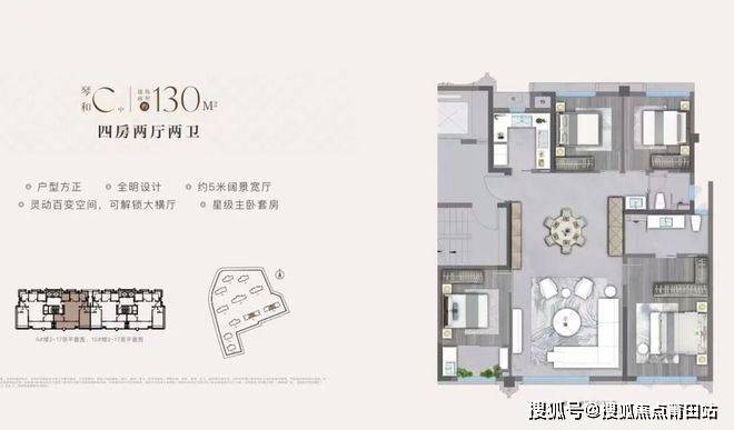 165-189㎡主力户型:LDKB 一体化大方厅,3.3 米层高,270° 寰幕视野;户户 6.1 米挑高错层空中花园,双主卧套房带独立卫浴与衣帽间,空间可灵活拆分,满足多孩、三代同堂居住。