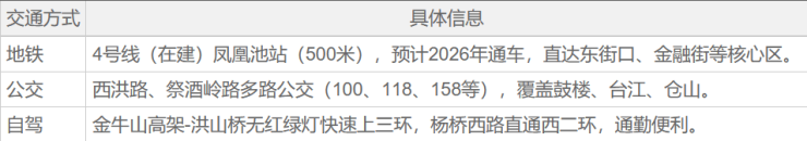 3. 通勤依赖自驾/地铁:4号线(在建)提升未来出行便利性。