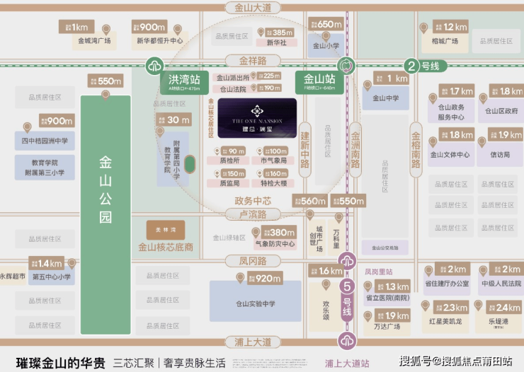双地铁配置:步行约475-600米可达地铁2号线洪湾站,约640米可达2/5号线换乘站金山站,属于标准的“双地铁房”。