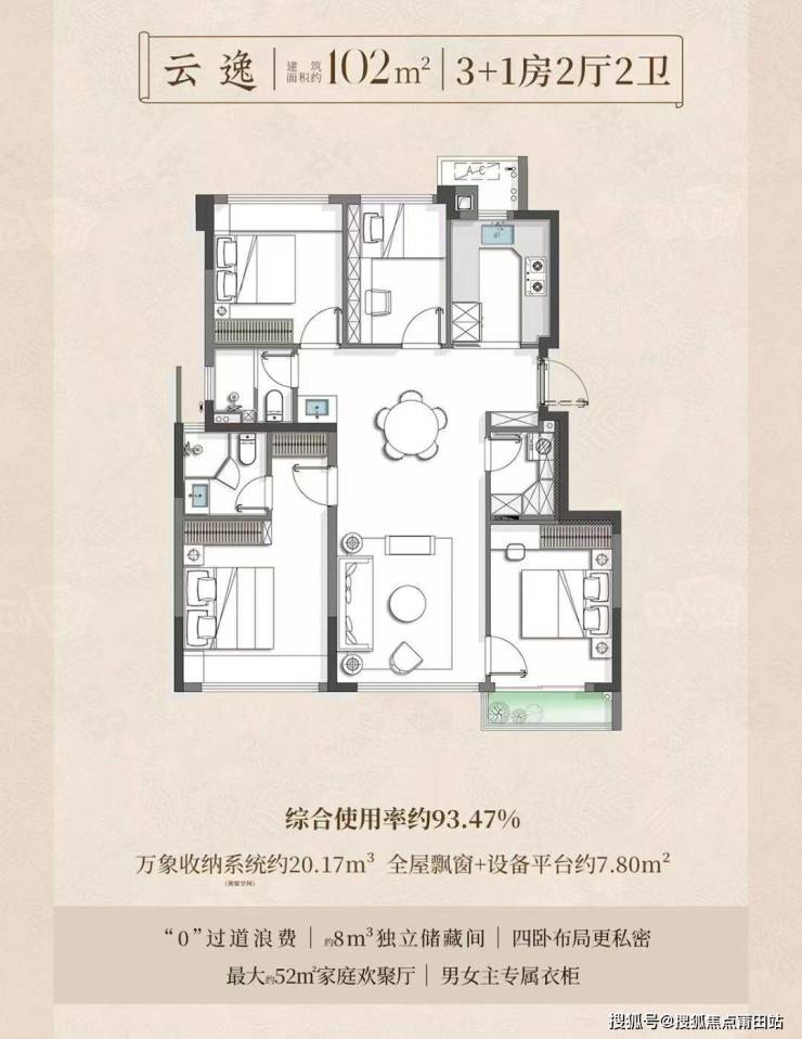102平方米户型得房率更高,约93.47%,但户型布局略显杂乱。厅堂空间感觉较小,餐厅位置安排较为奇怪。