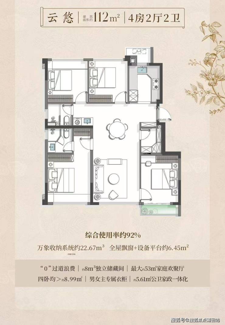 超高得房率是其最大亮点:89㎡得约91%,102㎡得约93.5%,112㎡得约92%,这意味着同等面积能享受更大空间。