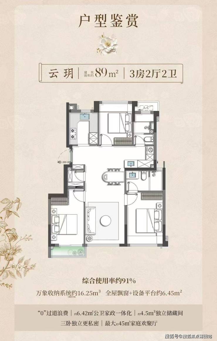 89平方米户型虽然使用率高达91%,但也存在一些设计上的取舍:未做到动静分离、餐厅和厨房位置有点远、北边的房间门需打开才能实现南北通透。