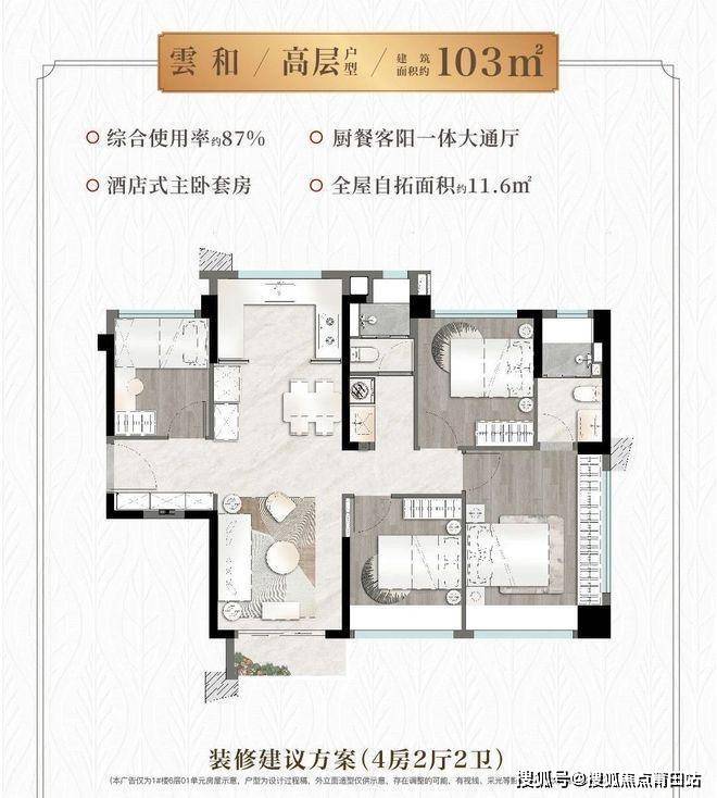 1号楼预售单价4.91万/㎡起!积有面95㎡三房两厅和103-116㎡四房两厅三个户型,86-89%的超高得房率。