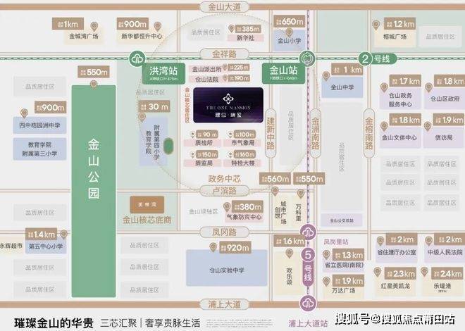 建总·瑞玺位于金山核心居住区,该区域已断供多年,新土地供应极其有限。项目坐落在金山大道和浦上大道之间的核心腹地,周边配套成熟,拥有金山万科里、金山地铁站(2号线与5号线换乘站)、金山公园、省立金山医院、万达广场等优质资源,全部在2公里范围内。这种核心位置的稀缺性,为其奠定了坚实的价值基础。