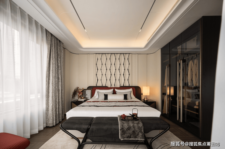 在本案的卧室空间内,有着酒店式私享主卧的氛围,高品质舒适家具,柔和的色彩辅以简洁的线条,整洁有序的陈列、收纳体系,予人以十足的放松感。