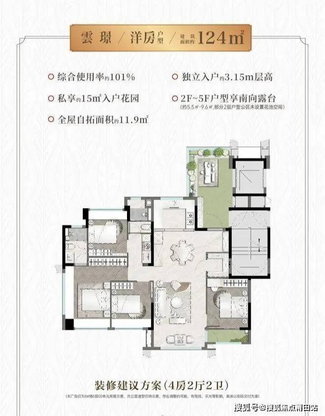 配备15㎡入户花园及2-5层南向露台,层高3.15米,空间尺度媲美别墅。